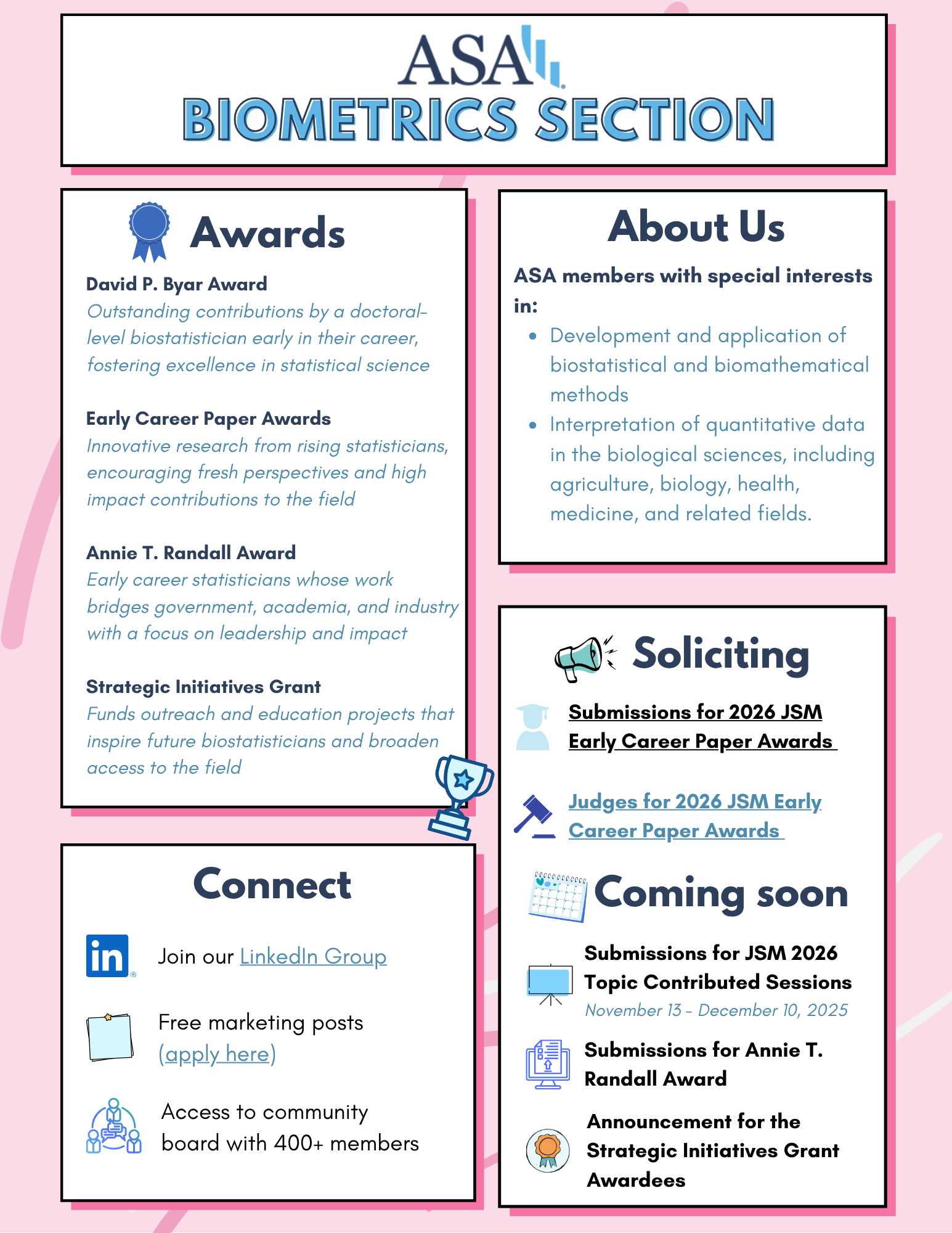 The Biometrics Section is for ASA members with special interests in the development and application of biostatistical and biomathematical methods and the interpretation of quantitative data in the biological sciences, including agriculture, biology, health, medicine, and related fields. The Biometrics Section will represent these interests within the ASA and cooperate with outside groups, most notably the North American region of the International Biometric Society, the Statistics Section of the American Public Health Association, Society for Clinical Trials, and Section U of the American Association for the Advancement of Science, furthering common purposes.