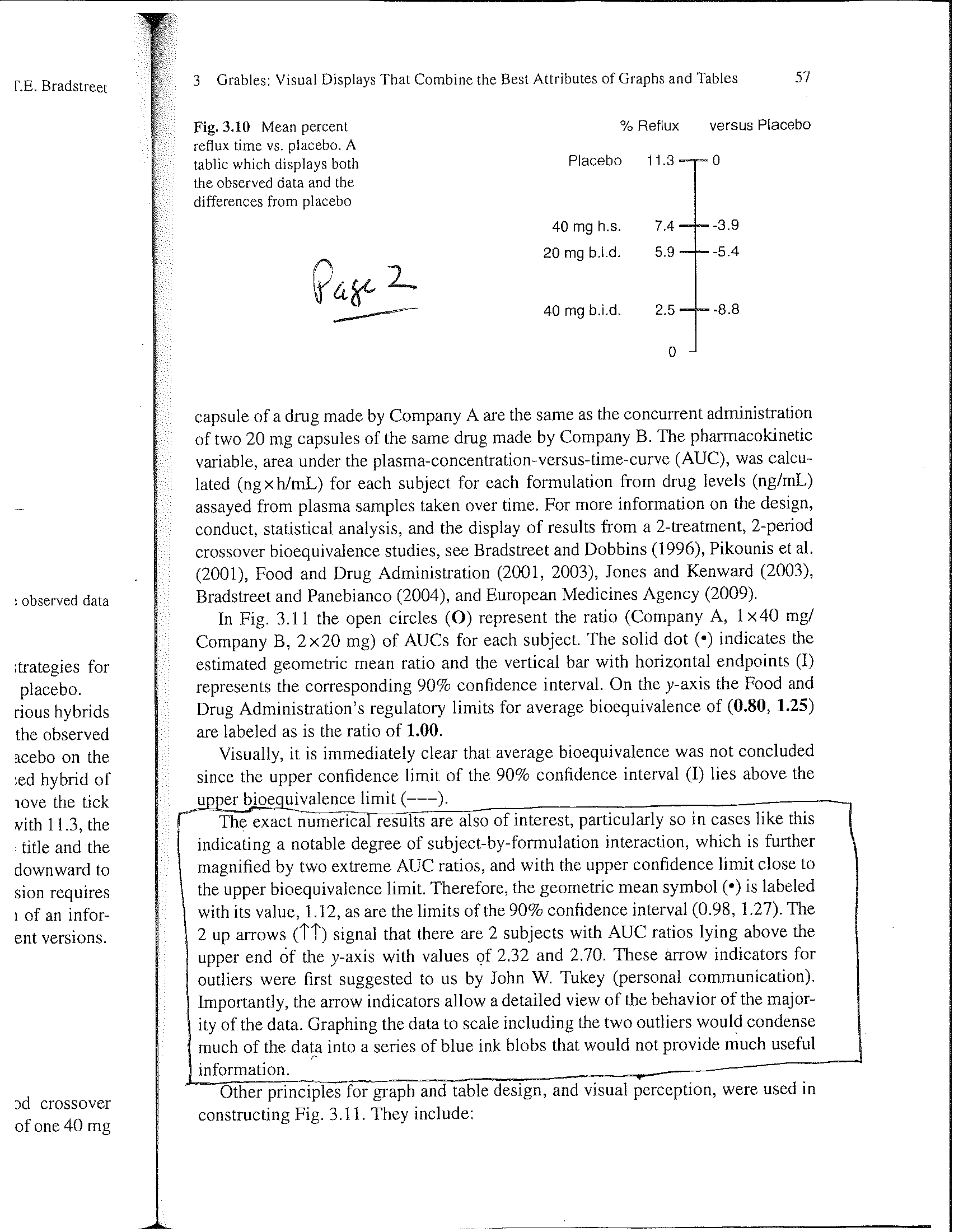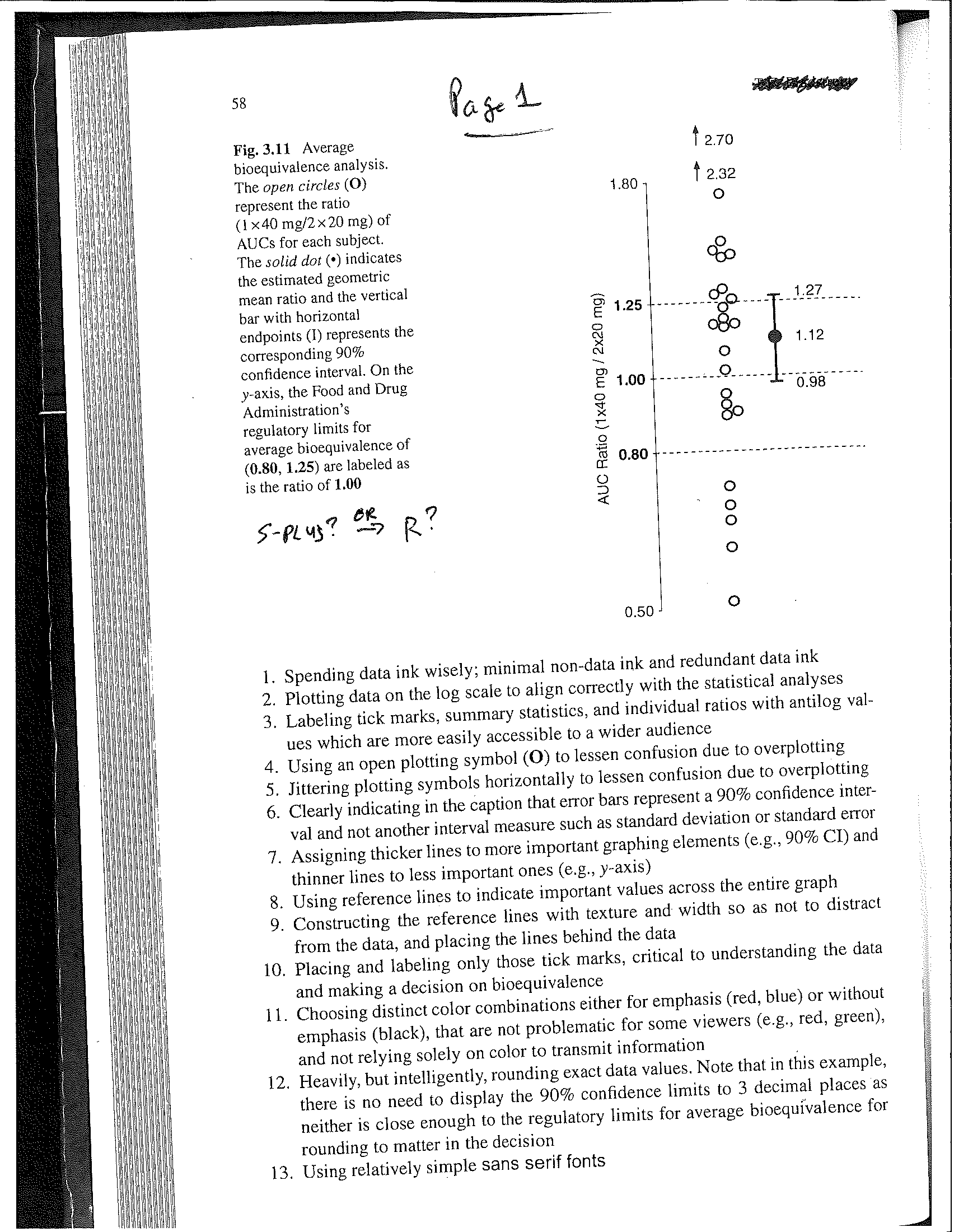 Example 1 (Pages 1 and 2): Univariate. The "up arrows" indicate that there are some "way out" / "far out" values of sizes 2.32 and 2.70, while allowing all the other points to be clearly visible. Constructed in either S-PLUS or R, I believe.