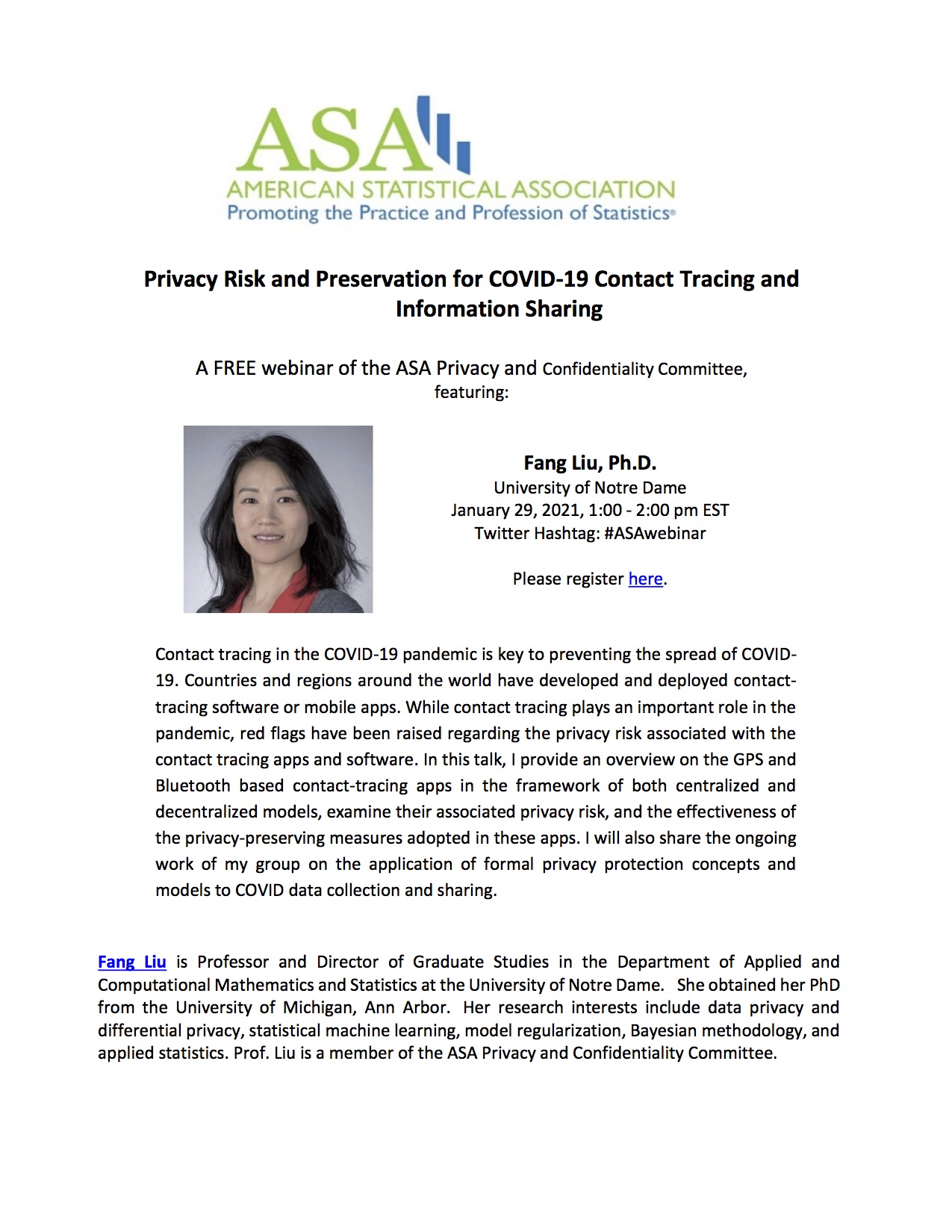 The ASA Committee on Privacy and Confidentiality will be hosting the annual free privacy day webinar on January 29th. Please see the attached flyer below for more details and register here.