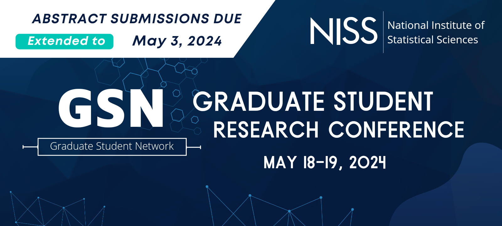 The NISS Graduate Student Network (GSN) is very excited to once again announce our 4th annual two-day Graduate Student Network Research Conference. Last year's conference in 2023 was a resounding success with many fantastic presentations and selecting winners was quite a challenge! This year's conference will be a two-day event and take place on Saturday, May 18 and Sunday, May 19, 2024, from 12pm - 5 pm ET each day.