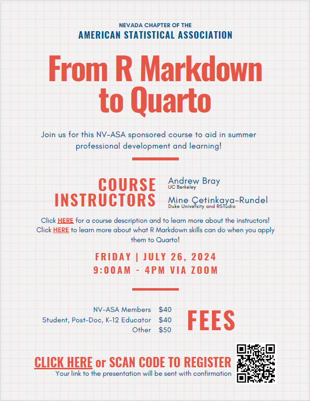 Take your R Markdown skills to the next level by applying them in Quarto, which is an open-source publishing system to create documents, books, presentations, blogs, and more. See the Course Description and learn more about the instructors here: