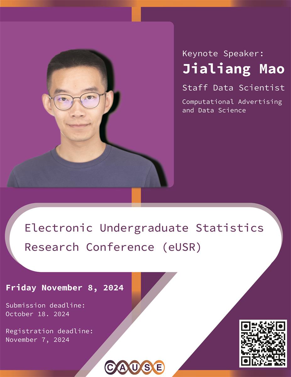 The keynote speaker is Dr. Jialiang Mao representing LinkedIn (https://www.linkedin.com/in/jialiangmao/). There will be sessions on statistics careers and graduate school. Winners of the Undergraduate Statistics Project Competition (https://causeweb.org/usproc) will give plenary talks. Your students can also get to present their work in the virtual presentation session.