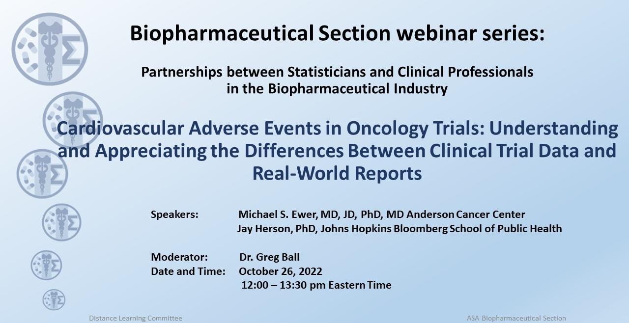The ASA Biopharmaceutical Section is pleased to announce the following webinar, presented by Dr. Jay Herson and Dr. Michael S. Ewer on October 26, 2022. The Distance Learning Team is hosting a new webinar series on Partnerships between Statisticians and Clinical Professionals in the Biopharm Industry. Each quarter we will have a clinical and statistical scientist pair to provide pragmatic and motivating examples of cross-disciplinary scientific engagement in biopharmaceutical research.